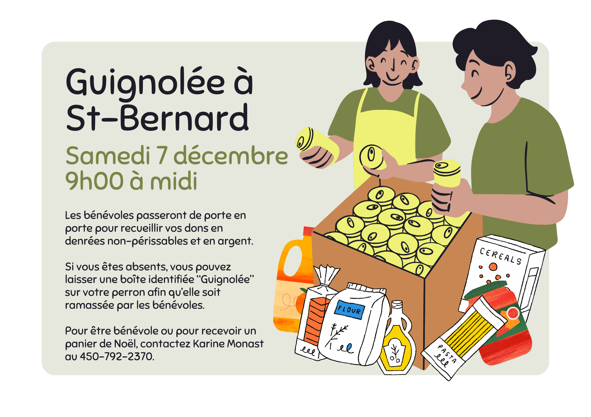 Les bénévoles passeront de porte en porte pour la collecte de denrées non-périsables et/ou argent.
